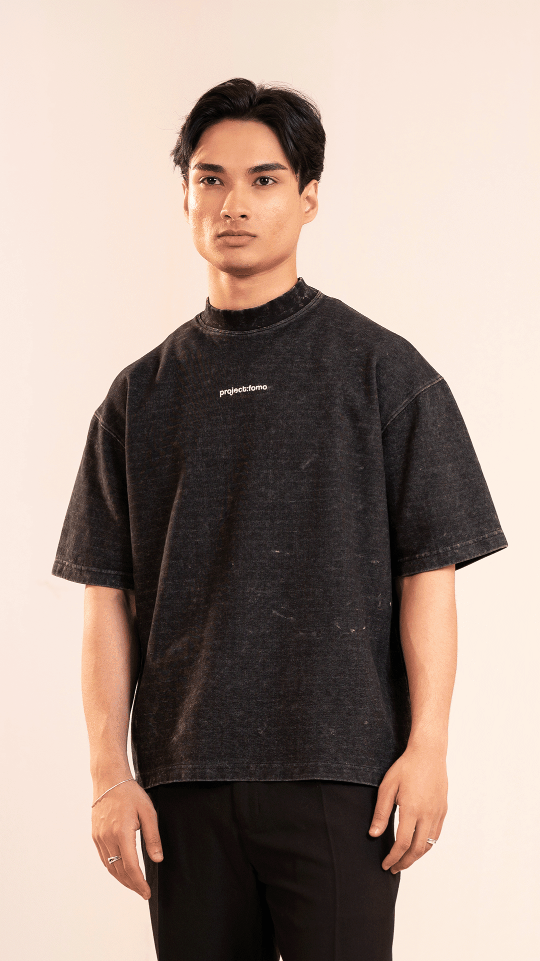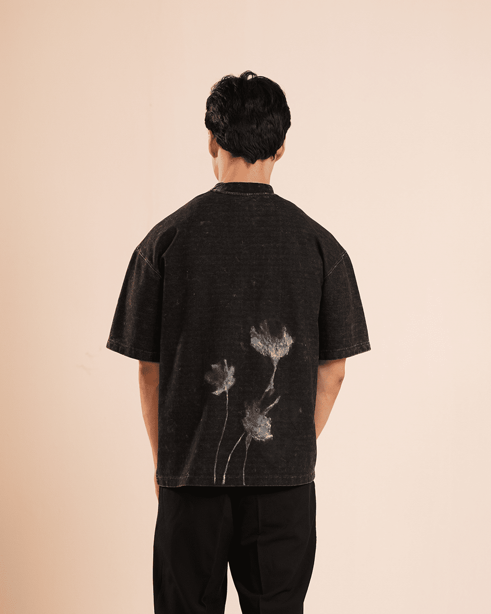A charcoal acid wash tee with soft white florals on the back — raw texture meets delicate detailing.