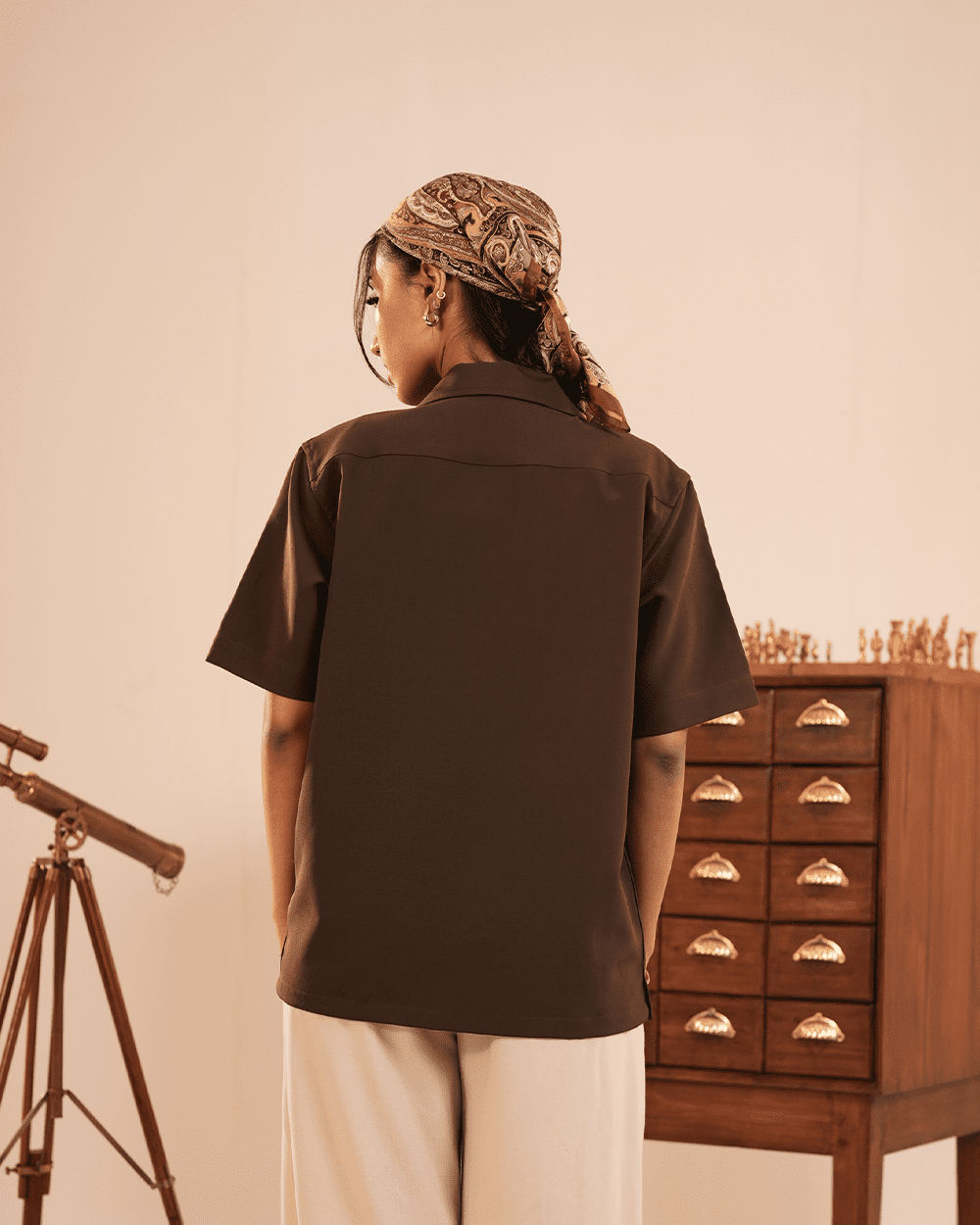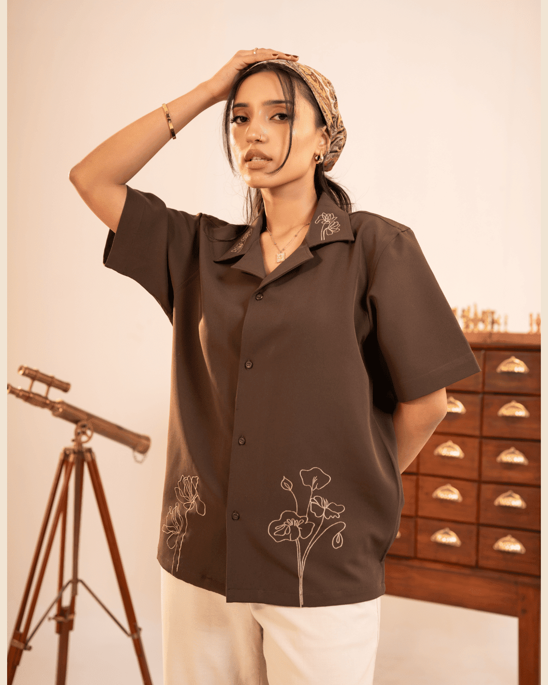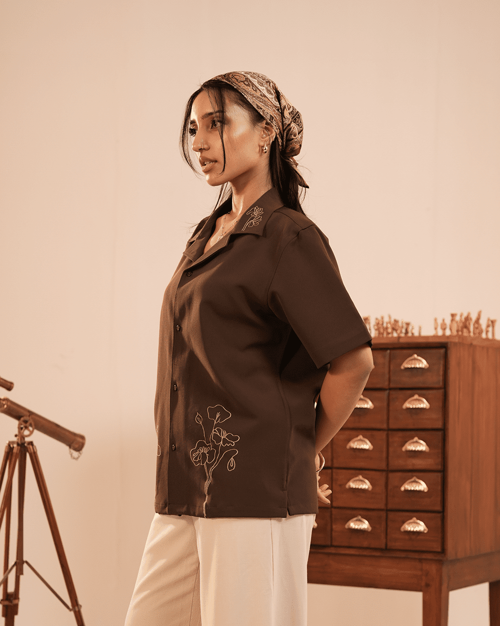 A structured half-sleeve shirt with subtle floral embroidery in deep umber.
