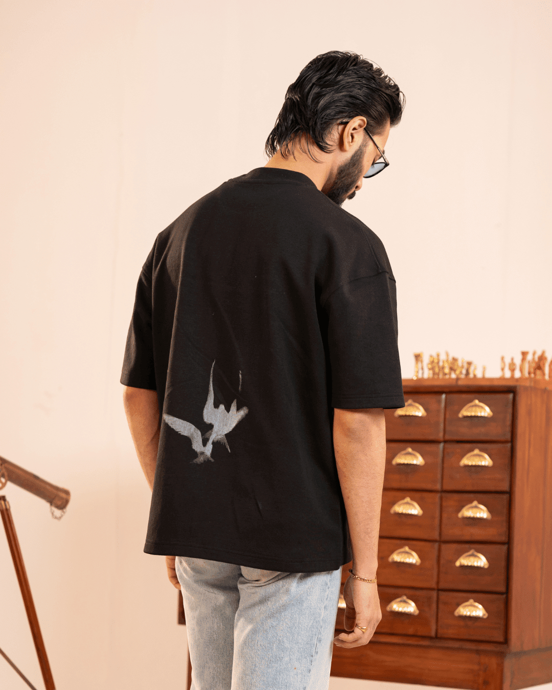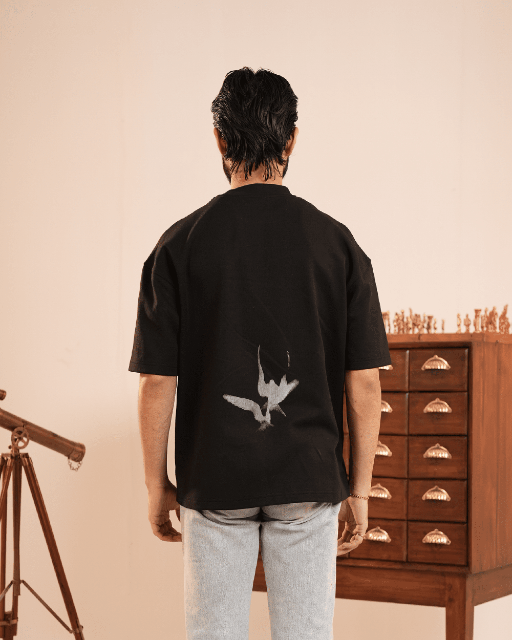 A black tee with a minimalist chest logo and a single bird in flight on the back — understated front, poetic detail behind.