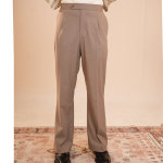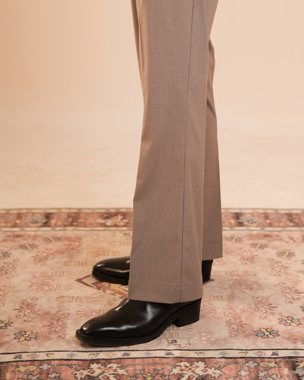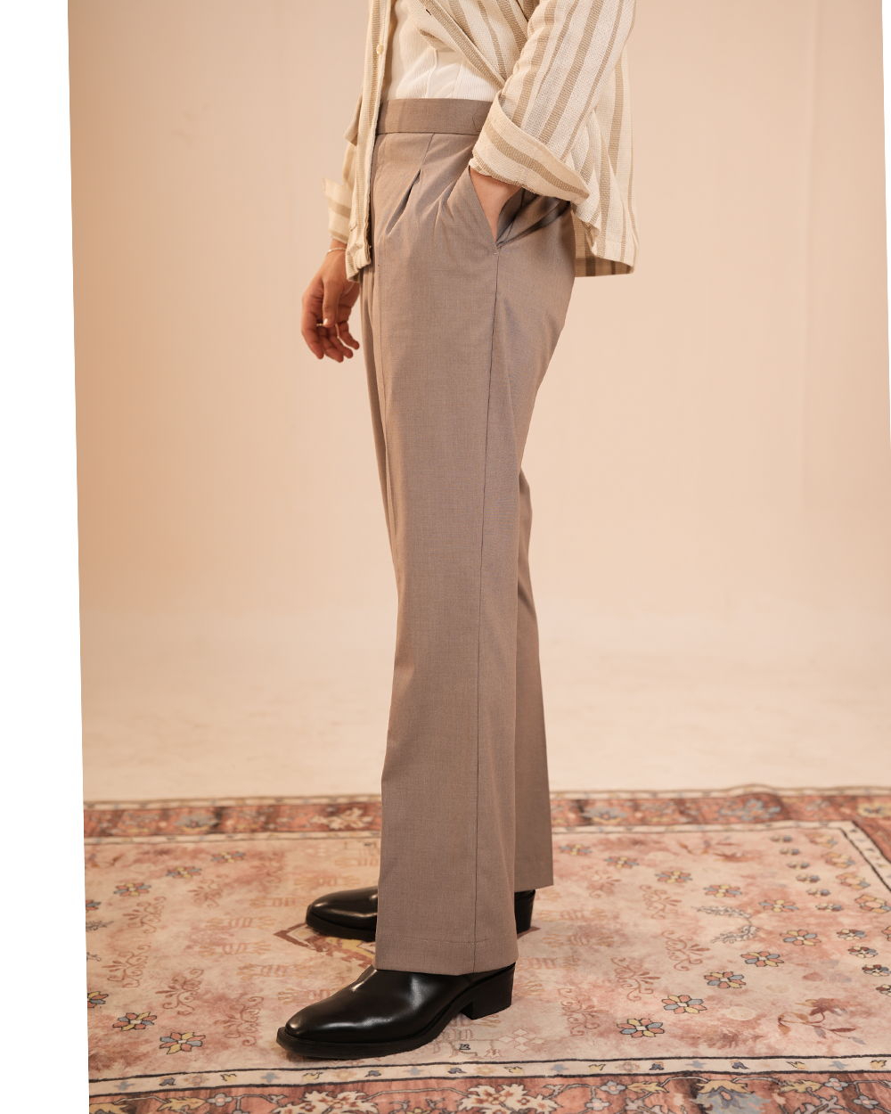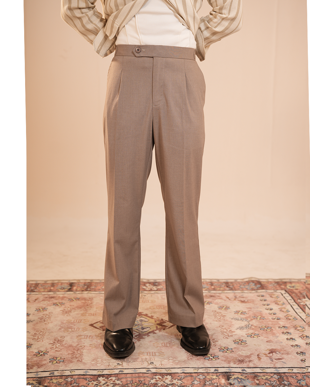 Tailored flared trousers in a rich tone of beige gray, finished with double pleats and side adjusters.