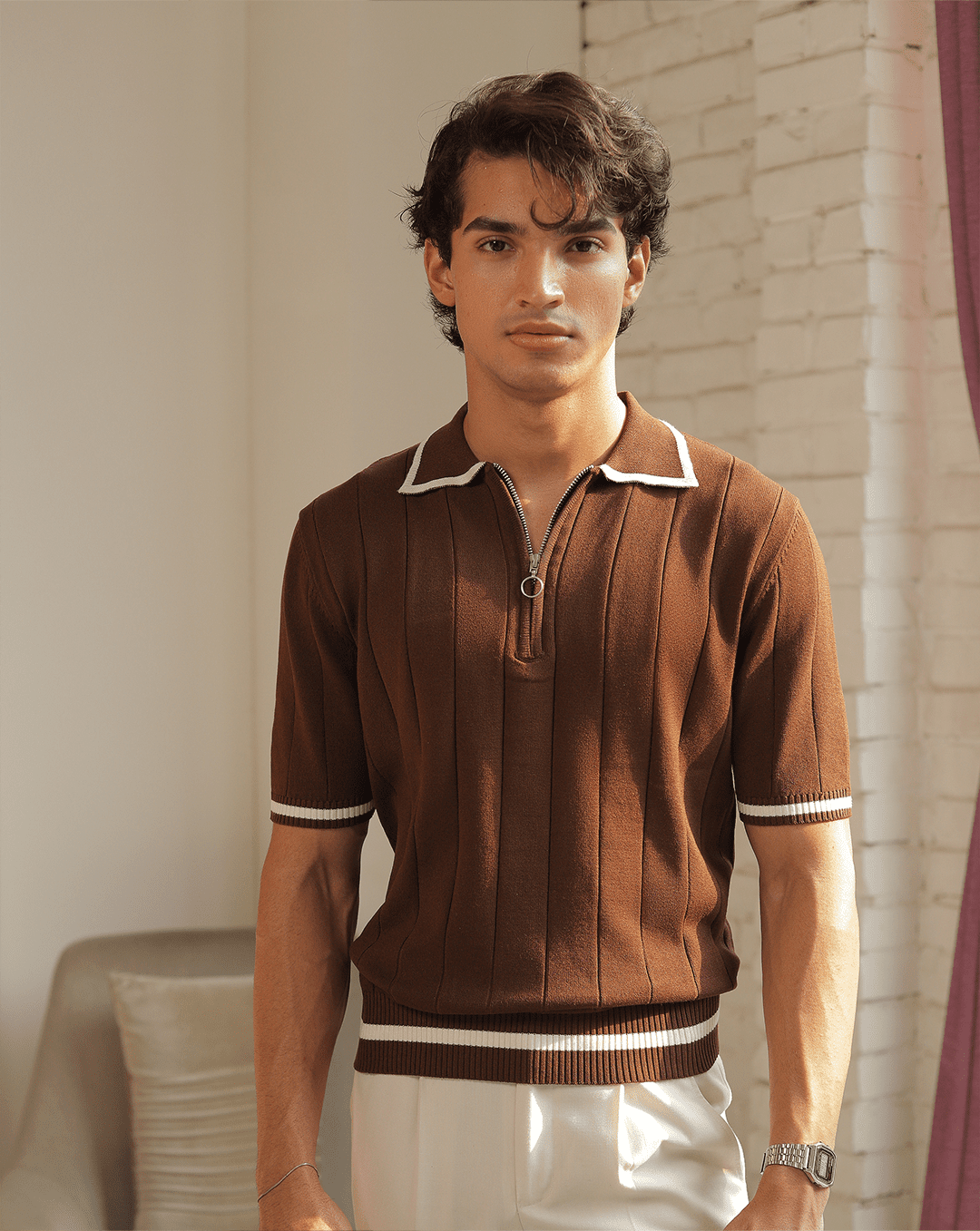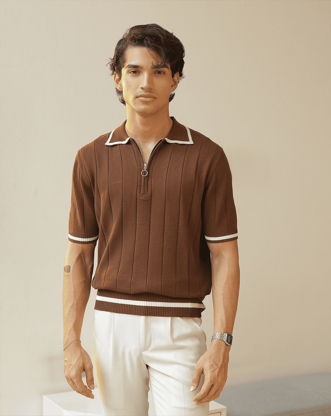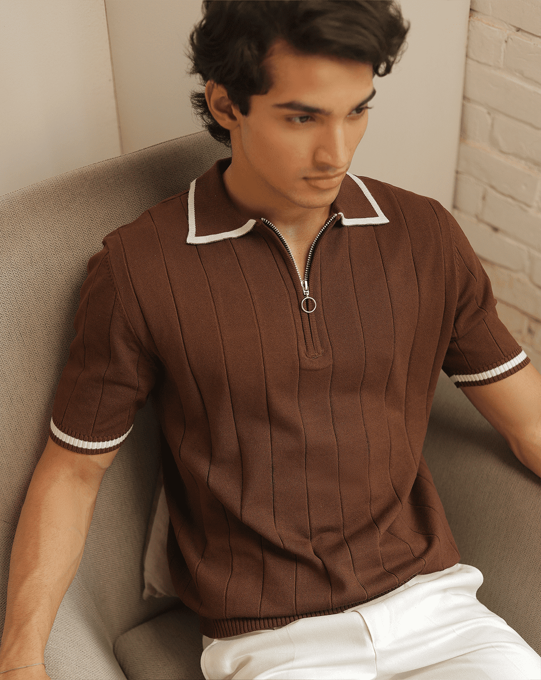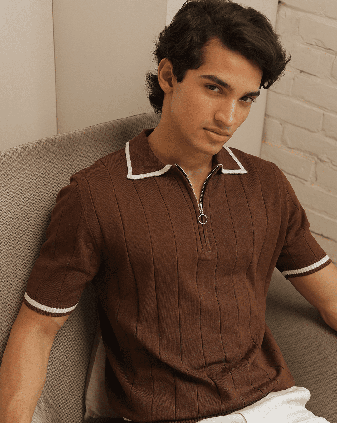 Masami | Coffee Textured Knit Polo Shirt