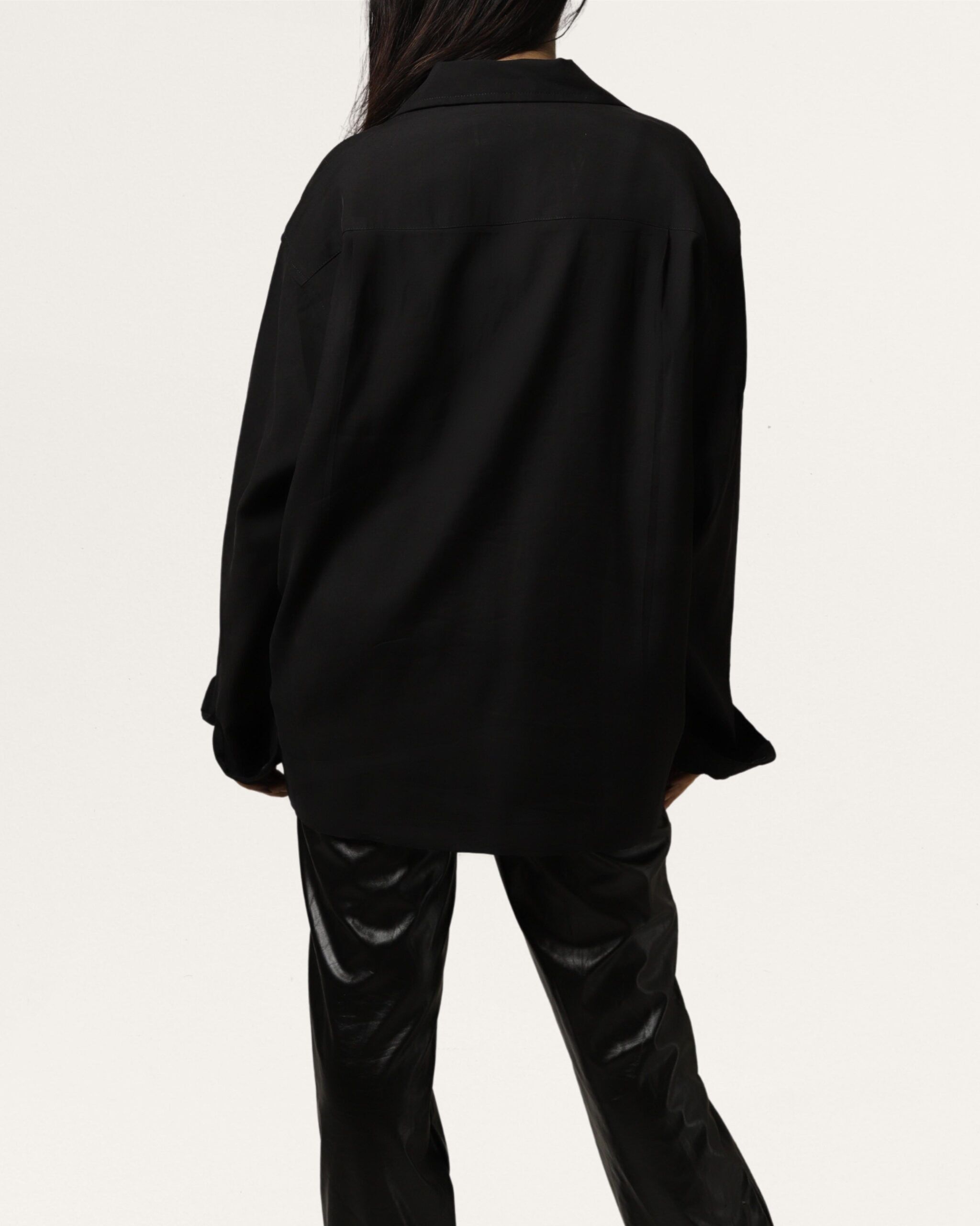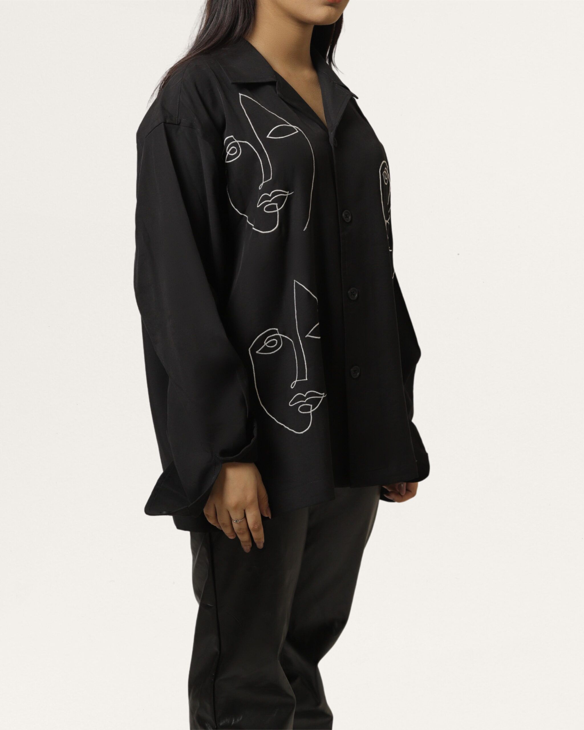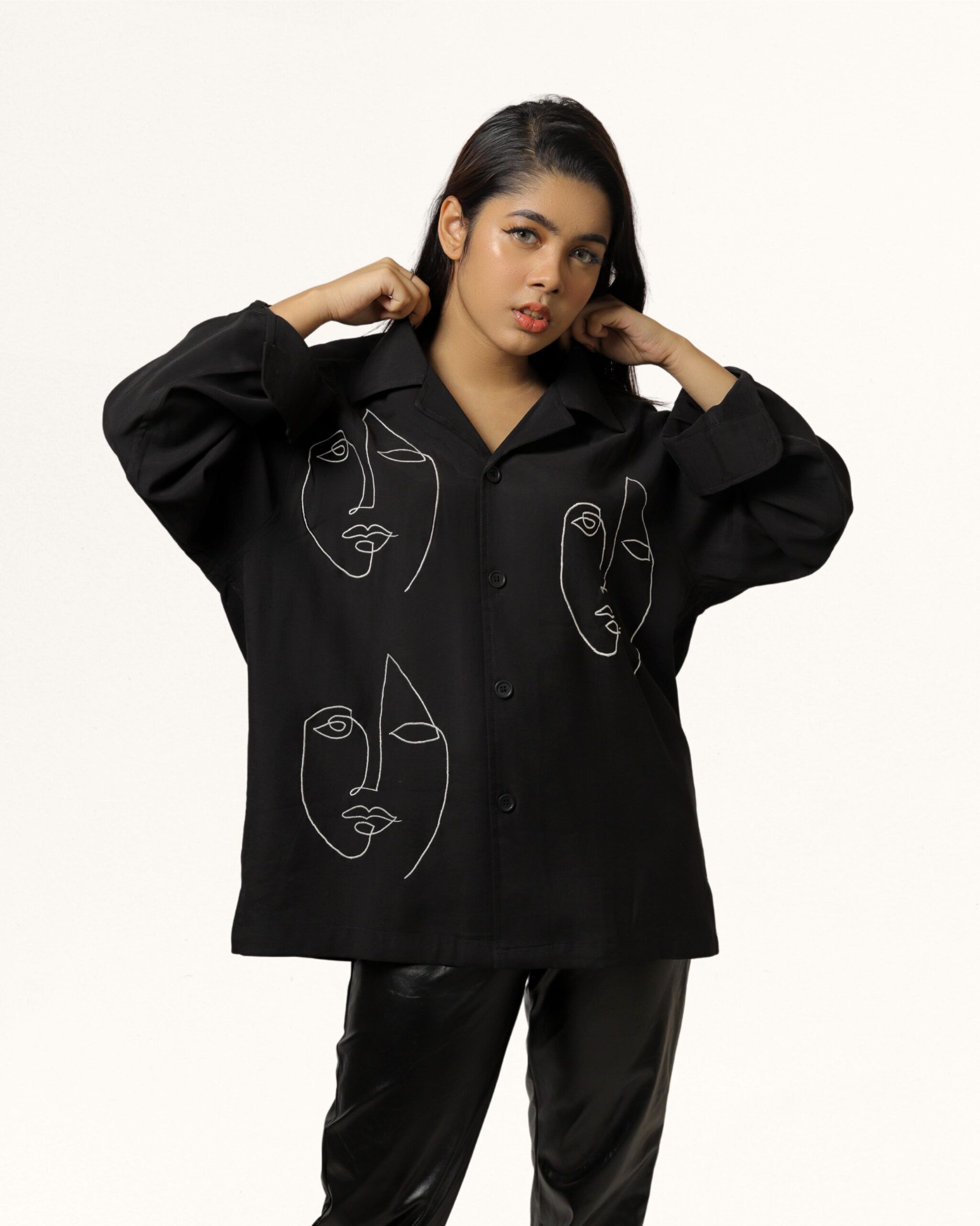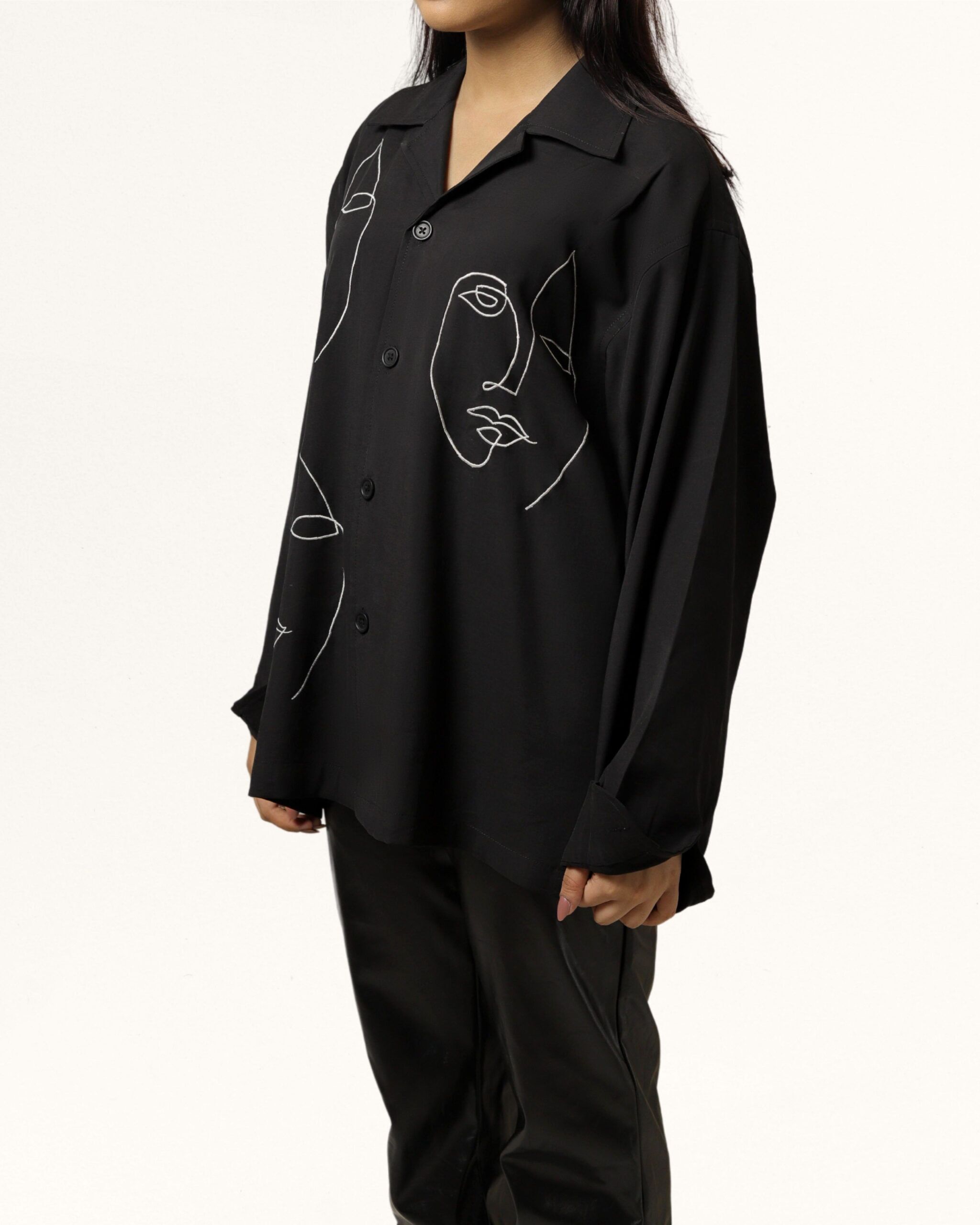A relaxed fit shirt featuring a cuban collar, long sleeves, and face motifs.