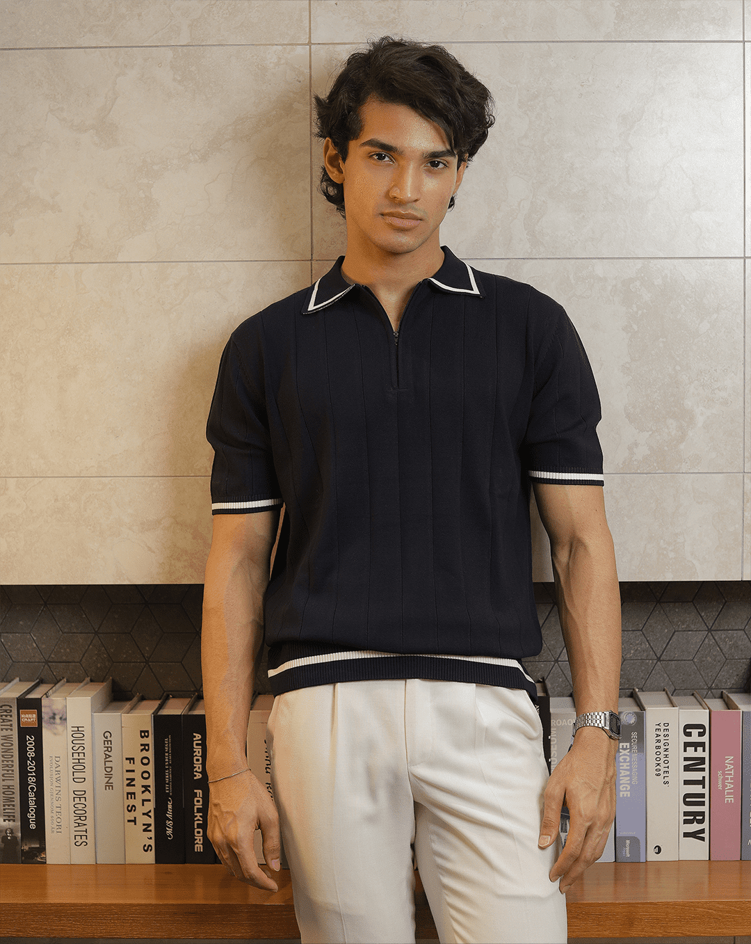 Reverie | Navy Textured Knit Polo Shirt