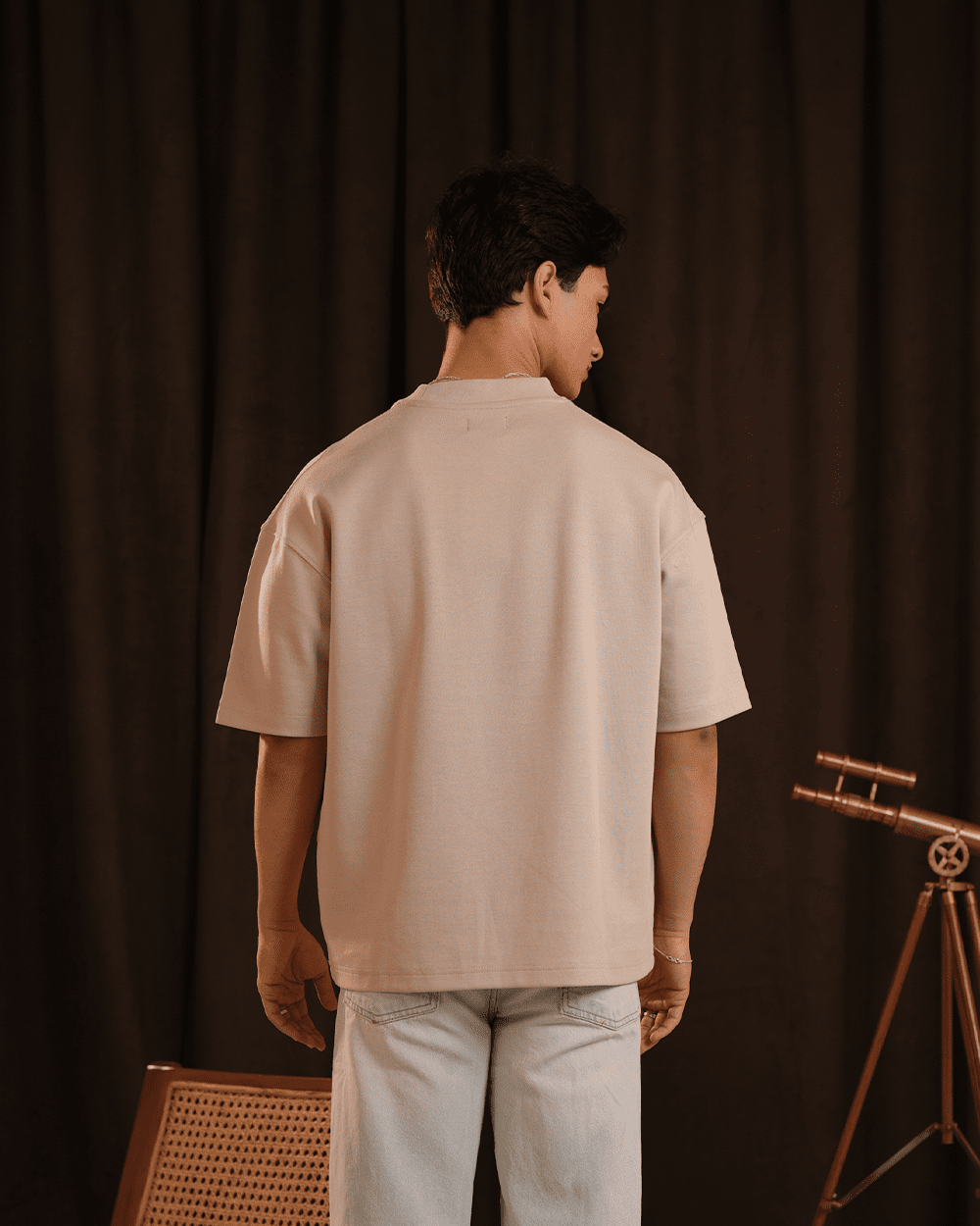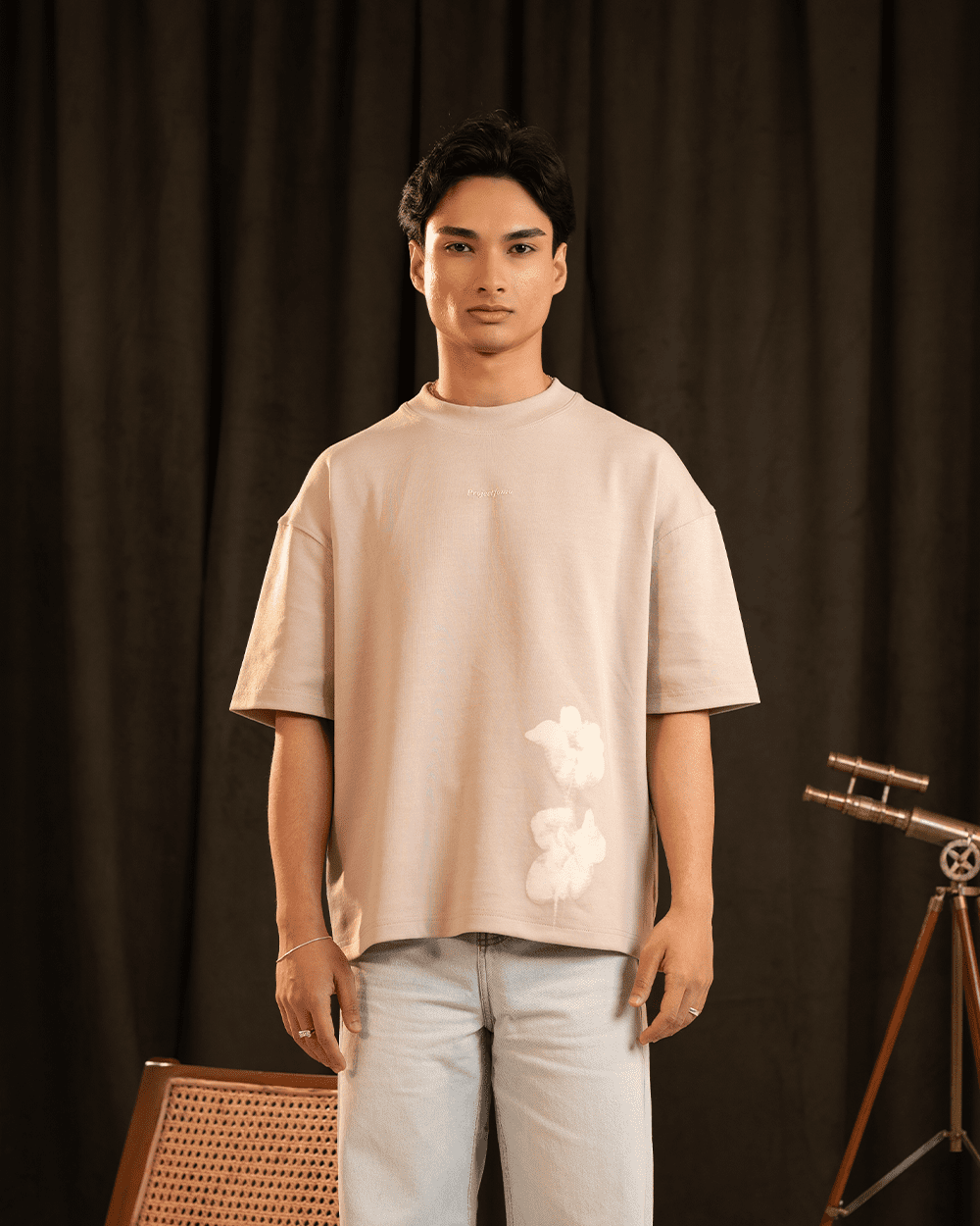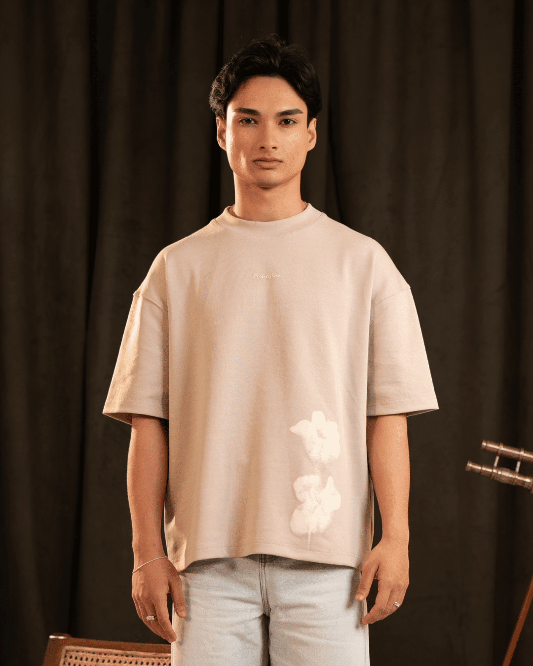 A dune-toned tee with soft-focus florals placed near the hem — subtle yet expressive.