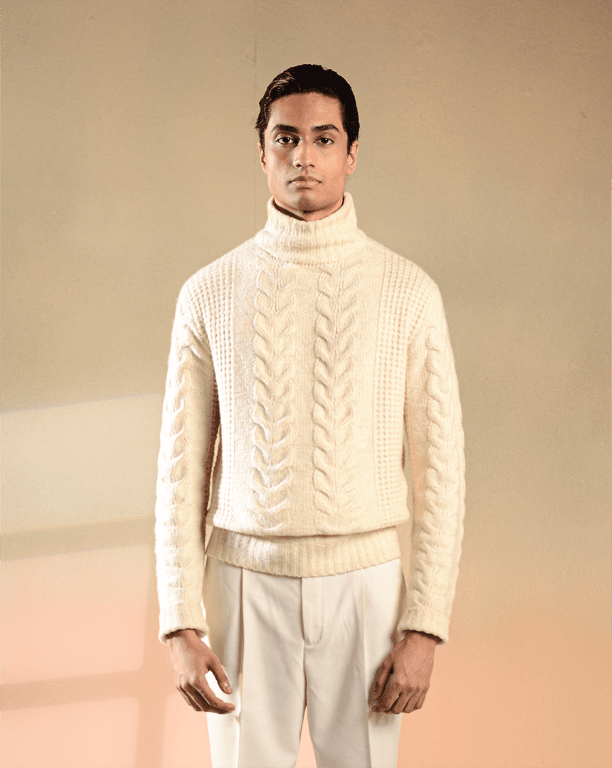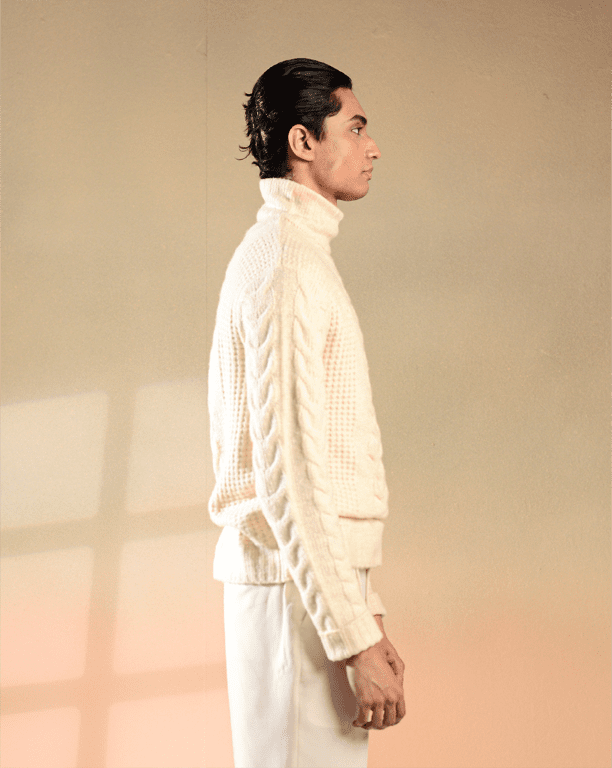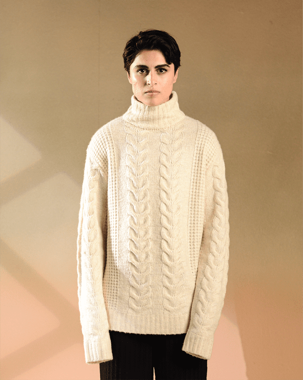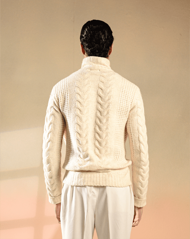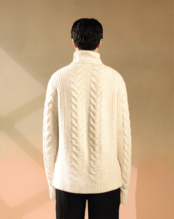- Cable-knit design for timeless texture